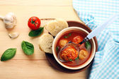 Zupa pomidorowa z kulki mięsa na drewnianą łyżką na drewniane tła