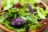Talerz świeży zielony sałatka na drewnianym stole z bliska