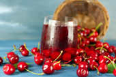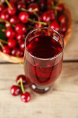 Szklanka świeżego soku z wiśni na drewnianym stole z bliska