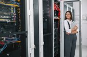 Kobieta w białej koszuli zarządza sprzętem serwerowym we współczesnym centrum danych.