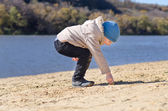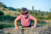 Sportowy młody chłopak robi Push up na górę głaz
