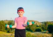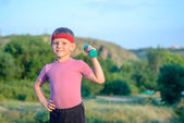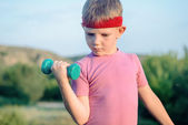 Silny chłopiec w zewnątrz ćwiczenie podnoszenia hantle