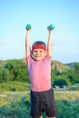 Cute Boy Lifting Dumbbell with Right Hand on Waist