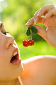Kobieta trzyma kilka truskawek