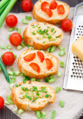 Zdjęcie "Podejmowania pomidor bruschetta - crostini serowe czosnek i posiekane pomidory z ziołami" może być wykorzystywane do celów osobistych i komercyjnych zgodnie z warunkami zakupionej licencji Royalty-free. Obraz jest dostępny do pobrania w jakości wysokiej rozdzielczości do 5760x3840.