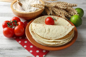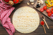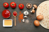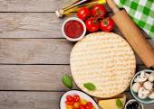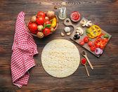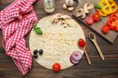 składniki do gotowania pizza na drewnianym stole, widok z góry