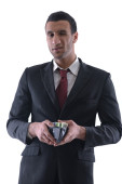 Podwójnej ekspozycji z low poly projekt miasta i biznesmen