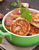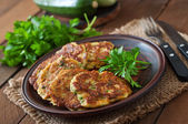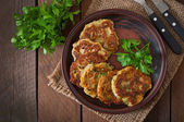 Naleśniki z cukinią z pietruszką na drewnianym stole.
