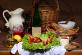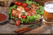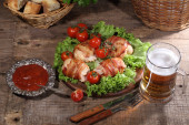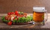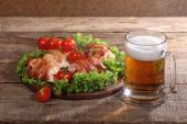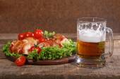 Piwa w przezroczysty kubek i naganiaczy kurczaka w boczku przekazywane