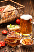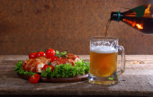 Piwa w przezroczysty kubek i naganiaczy kurczaka w boczku przekazywane