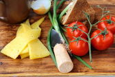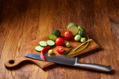 szparagi, pomidory, czosnek, grzyby w koszu na tle drewniane