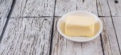 Blok z masła, margaryny i masła ghee w białe miski na rustykalne drewniane tła