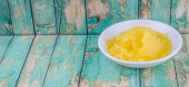 Blok z masła, margaryny i masła ghee w białe miski na rustykalne drewniane tła