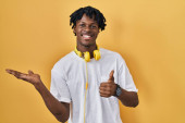Młody człowiek uśmiecha się z kciukami do góry, nosząc niebieską koszulę na odizolowanym żółtym tle, wyrażając pozytywność i pewność siebie w radosnym, żywym otoczeniu.
