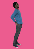 Młody człowiek uśmiechnięty dłońmi wyciągniętymi na żywe żółte tło, ukazujący pogodny i pewny siebie wyraz twarzy w nowoczesnym otoczeniu portretowym.