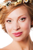Portret młodego piękne szczęśliwa panna młoda z stylowe makijaż i fryzurę, na białym tle