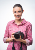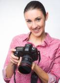 Uśmiechnięty fotograf z cyfrowy aparat fotograficzny