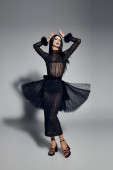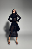 Zdjęcie "Młoda kobieta pokazuje swój zmysł mody w eleganckim stroju w szarej przestrzeni studyjnej." może być wykorzystywane do celów osobistych i komercyjnych zgodnie z warunkami zakupionej licencji Royalty-free. Obraz jest dostępny do pobrania w jakości wysokiej rozdzielczości do 5760x3840.