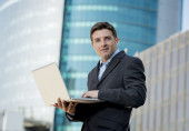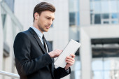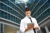 biznesmen posiadania cyfrowy tablicowy stojący na zewnątrz pracy Internetu