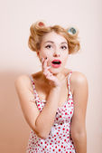 Blond elegant girl on sunny windows background, portrait