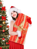 Boże Narodzenie dziewczyna w santa hat dając czerwone pudełko.