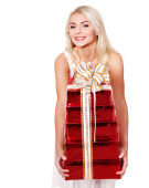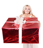 Boże Narodzenie dziewczyna w santa hat przytrzymanie pudełko czerwone.