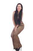 Emocjonalne młoda kobieta w skórzane spodnie na białym tle