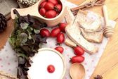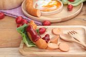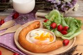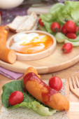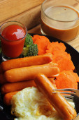 Śniadanie z jaja, kiełbasa, sałatka z warzyw i mleka.