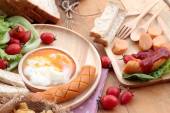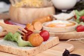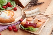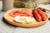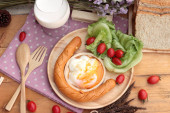 Śniadanie z jajek, kiełbasy, chleb, sałatka z warzyw i mleka.