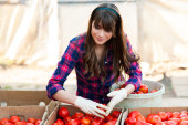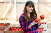 Młoda kobieta ręce z rękawicami, trzymając czerwone pomidory, pracujących w szklarni.