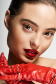 Młoda kobieta prezentuje swój elegancki styl na tętniącym życiem czerwonym tle, ucieleśniając urok sprężyn.