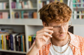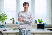 Uśmiechnięty długowłosy mężczyzna w stylowym stroju w pracowni warsztatowej.