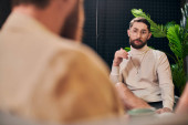 Zdjęcie "Uśmiechnięty długowłosy mężczyzna w stylowym stroju w pracowni warsztatowej." może być wykorzystywane do celów osobistych i komercyjnych zgodnie z warunkami zakupionej licencji Royalty-free. Obraz jest dostępny do pobrania w jakości wysokiej rozdzielczości do 5760x3840.