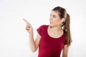 młody piękny szczęśliwy kaukaski kobieta skierowana w górę, biały na białym tle na