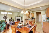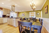 luksusowy duża kuchnia i pokój dzienny z zielonej ściany.