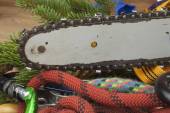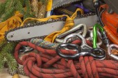 Used climbing gear on wooden background. Advertising boards of trade. The concept of extreme sports. Decoration of older equipment climbers.
