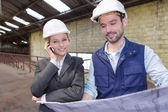 pracownik pokazuje do inspektora bezpieczeństwa systemu tworzenia