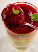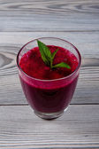 Szklanka soku buraczanego na drewnianym stole, zbliżenie