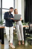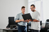 Zdjęcie "Dwaj koledzy angażują się we wprowadzanie na pokład we współczesnym biurze, koncentrując się na szkoleniu." może być wykorzystywane do celów osobistych i komercyjnych zgodnie z warunkami zakupionej licencji Royalty-free. Obraz jest dostępny do pobrania w jakości wysokiej rozdzielczości do 5760x3840.