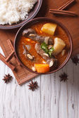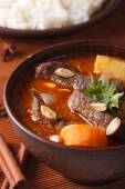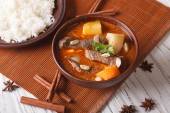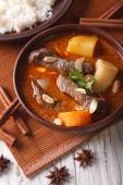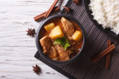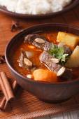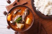 Thai beef massaman curry and rice side dish closeup. vertical to