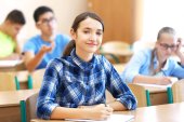 Piękne małe uczennica w klasie w pobliżu tablica