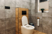 Toaleta wisząca na ścianie w czystej, kafelkowej toalecie