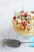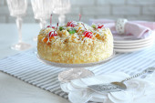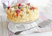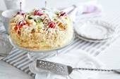 Masła ciasto z wiśniami na stoisko i ustawienia tabeli, na jasnym tle