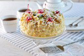 Zdjęcie "Masła ciasto z wiśniami na stoisko i ustawienia tabeli, na jasnym tle" może być wykorzystywane do celów osobistych i komercyjnych zgodnie z warunkami zakupionej licencji Royalty-free. Obraz jest dostępny do pobrania w jakości wysokiej rozdzielczości do 5760x3840.