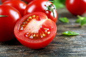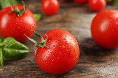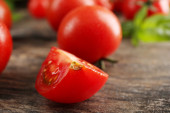 Pomidory wiśniowe z bazylią na drewnianym stole z bliska