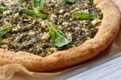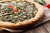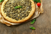 Otwarte ciasto ze szpinakiem i pomidorkami cherry na stole z bliska