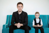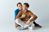 Szczęśliwy ojciec cieszy się chwilą z synem w przytulnym studio wypełnionym ciepłem.