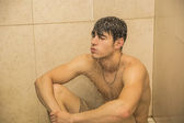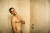 Atrakcyjny lekkoatletycznego młody człowiek biorąc prysznic