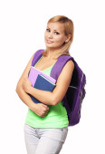 Student dziewczynka z plecakiem na białym tle. Powrót do szkoły