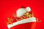 Boże Narodzenie prezenty w torbie na czerwonym tle